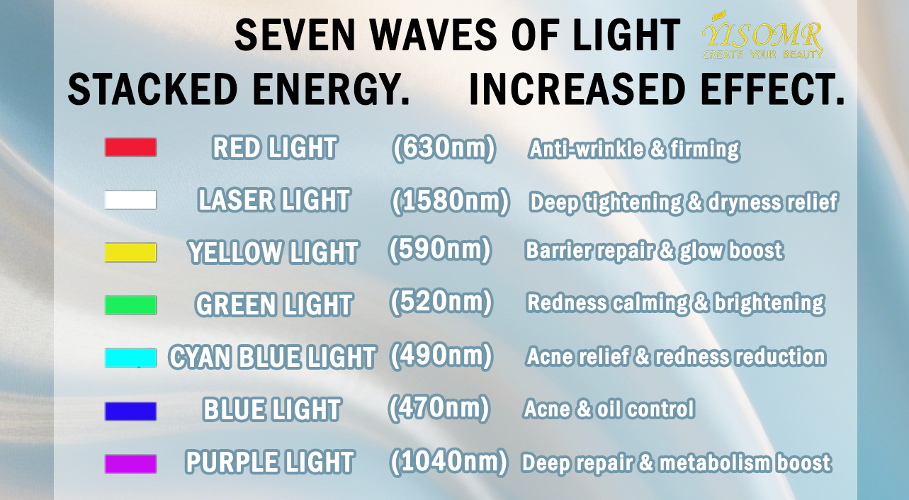 The mask® utilizes 7 research-backed wavelengths that dermatologists trust - each one proven to help your skin in different ways. covering 470nm–1580nm, to target different skin layers and solve multiple skin concerns with professional precision:
